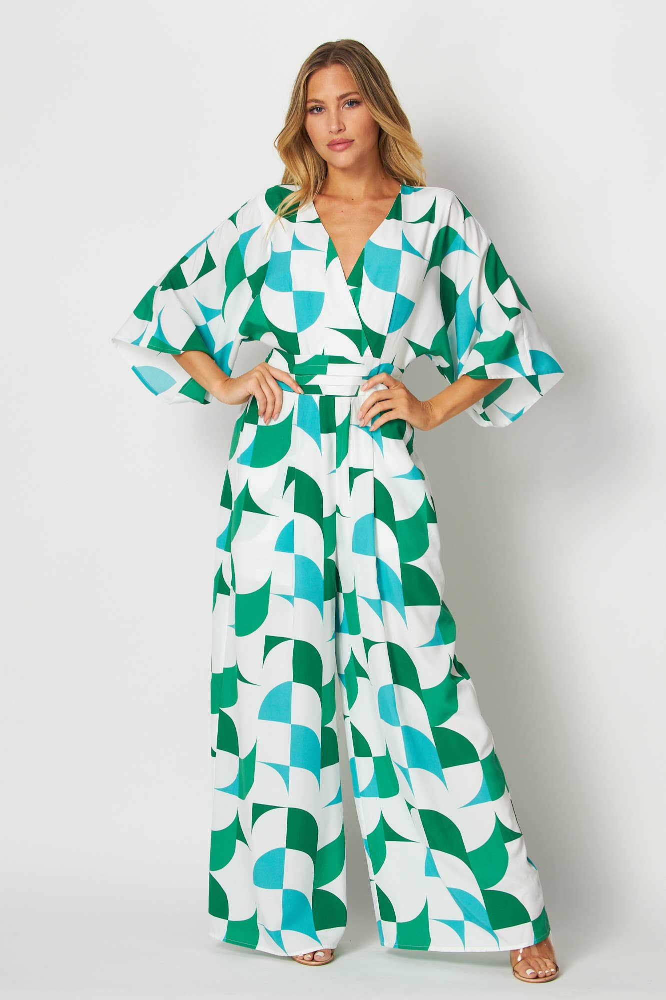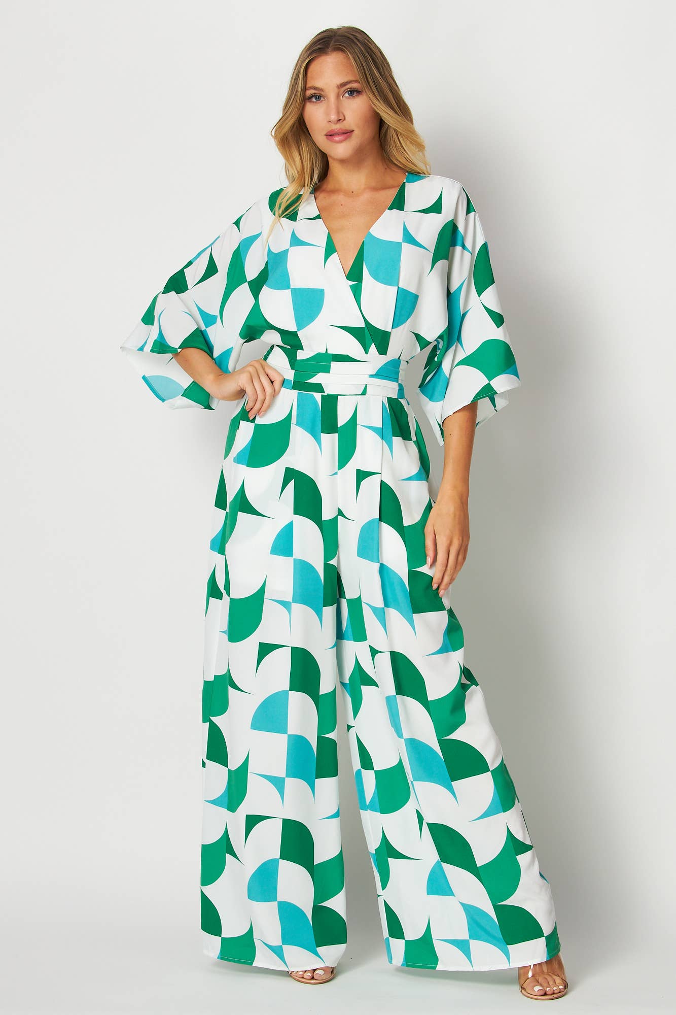 Infuse your chic closet with this woven color matching print 3/4 sleeve v- neck jumpsuit, it is both comfortable and fashionable. Choose Lauren jumpsuit as a stylish alternative to a dress for your next night out.