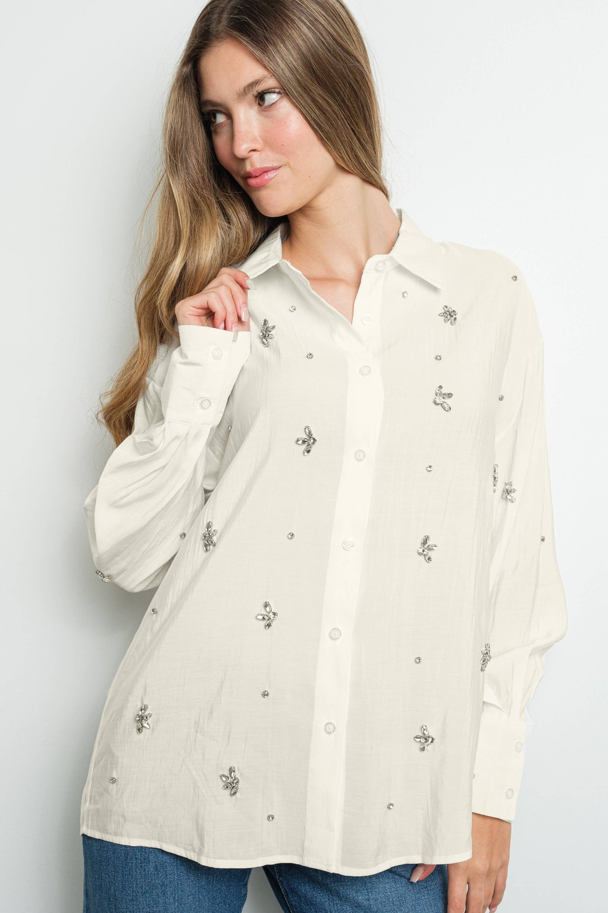 Add a touch of sparkle to your wardrobe with our Rhinestone Embellished Long Sleeve shirt. This elegant piece features delicate rhinestone detailing that elevates any look, making it perfect for both casual and dressy occasions. Available in two versatile colors-classic ivory and chic blue, this shirt offers endless styling possibilities. The soft fabric and tailored firt ensure comfort and sophistication, whether you are dressing it up for a night out or adding a hint of glamour to your everyday outfit