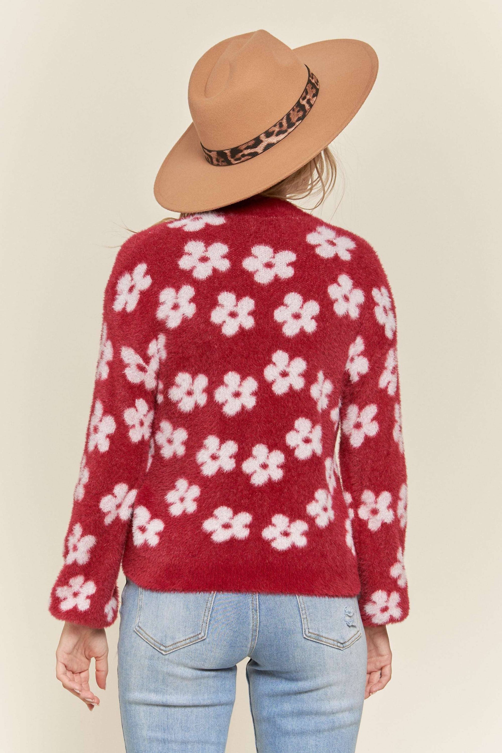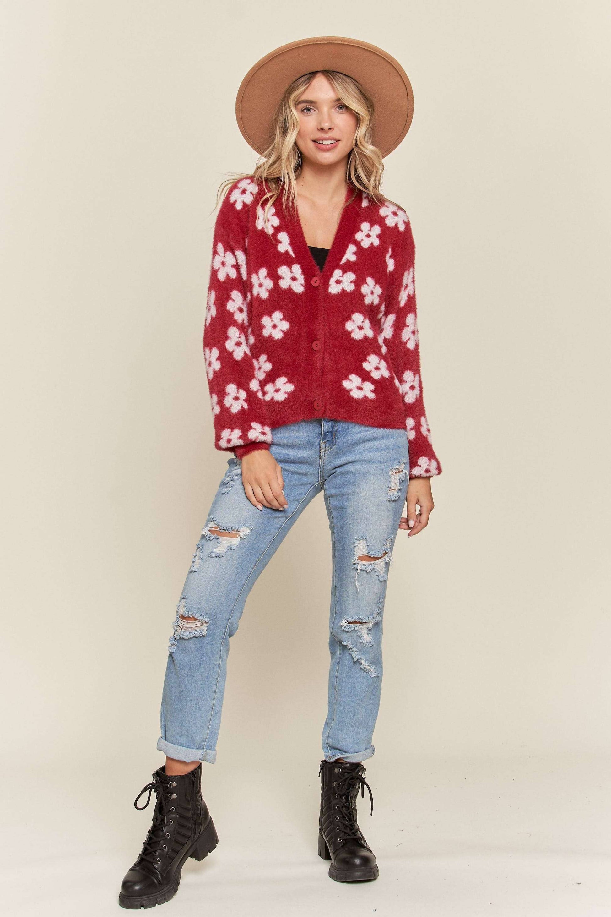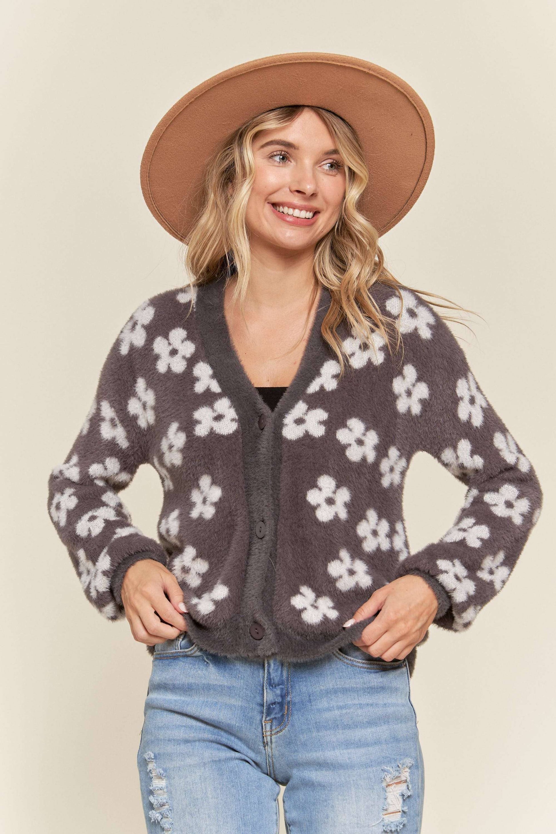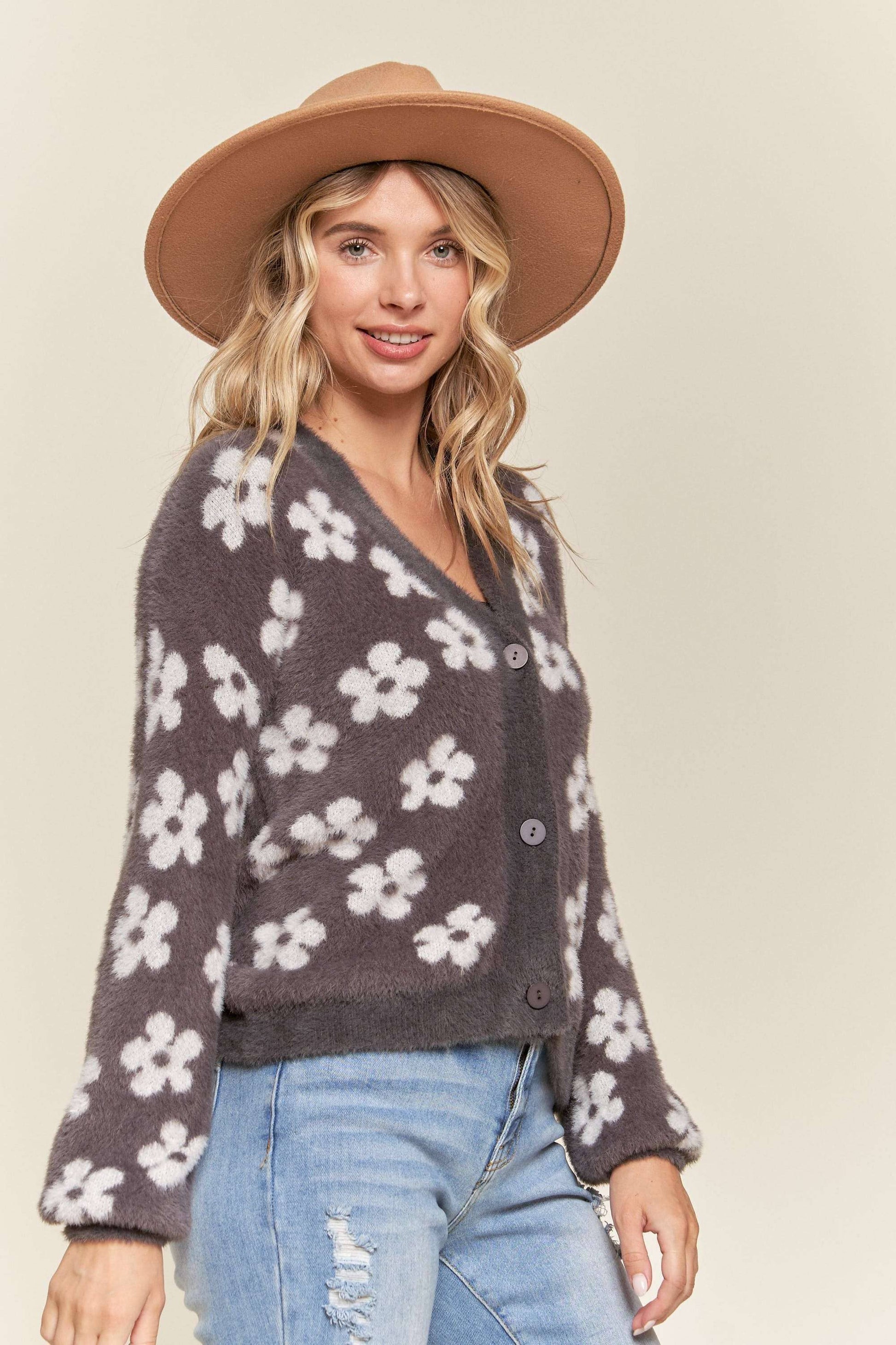 A warm and stylish cropped cardigan, designed with long sleeve, a button-front closure, and a soft, fuzzy texture adorned with floral patterns.